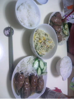 実家では、お母さんがサラダとしじみたこ焼きと焼き鳥をだしてくれました。
