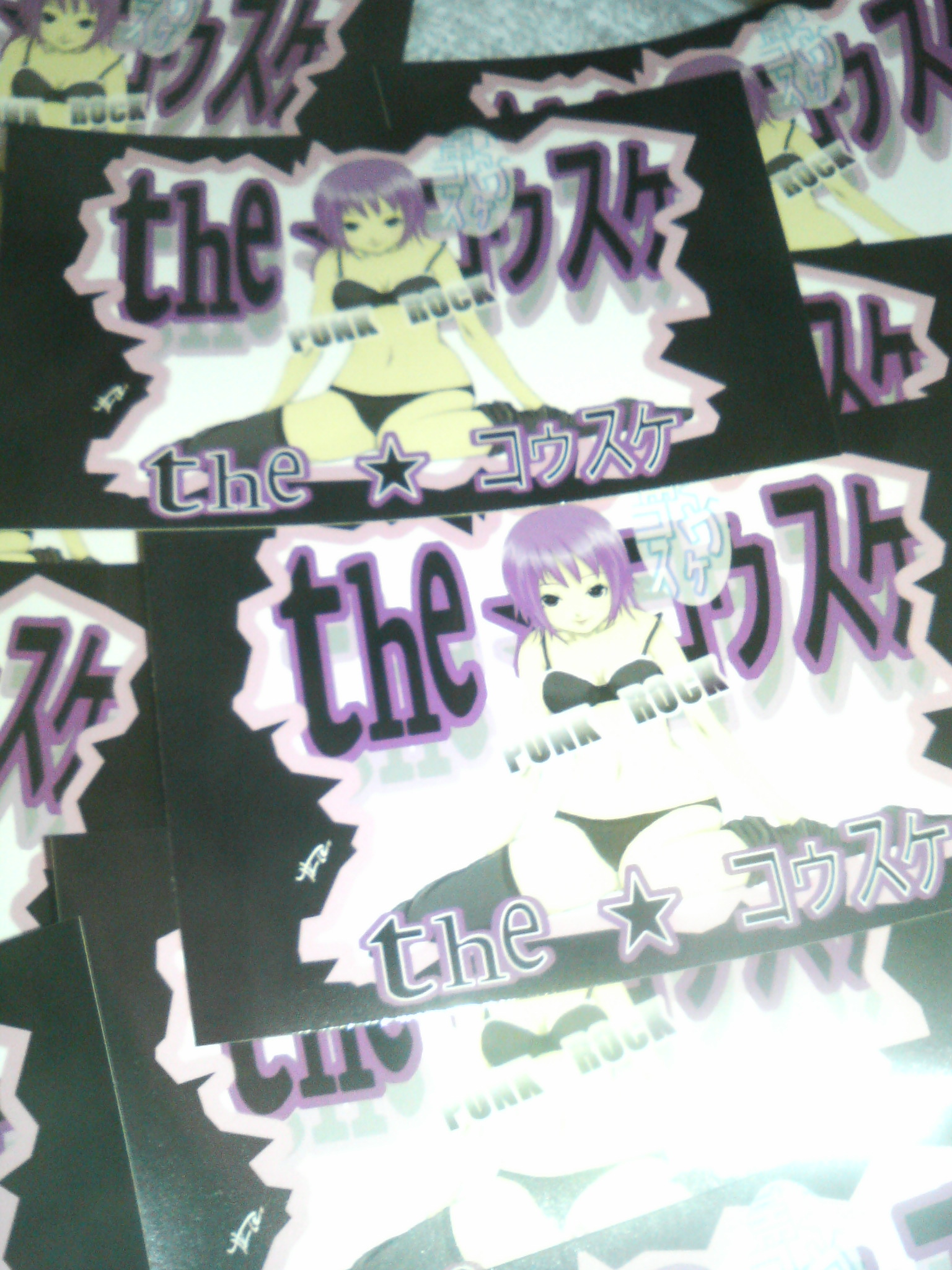 はい、ステッカーが大阪から届きました。ほんとにすごくかっこいいしエロイしかわいいしあげたらキリガありませんユキロンガーだふ。今回もデザインはTKOにおねがいしました。彼はとは五年くらいから?そんくらいの付き合いです。当時毎日一緒に飲んでましたねっ。前のバンドでもTシャツとかいろいろお世話になってます。彼の絵はほんと好きなんですボク。たくさん絵もらったけどミトッテ落ち着くんだね。部屋に貼ってある絵は全部そいつのです。また新作あったらもーらおっと。とにかくありがとうTKO☆キミは天才!俺は凡人。