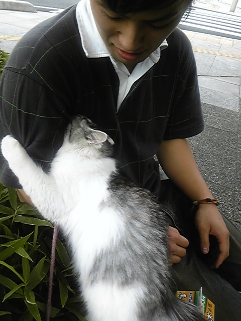 そしたら紐ってゆーかリード?に高そうな猫ちゃんが繋がれてました。かわいーけー触りよったら猫ちゃんに異変が。。。。