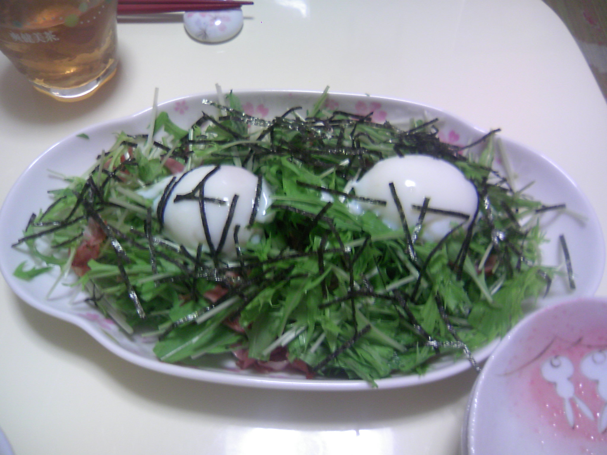 写真は嫁が最近習得した、ベーコンと水菜サラダ温玉乗せ(隠し味はワサビ)です。