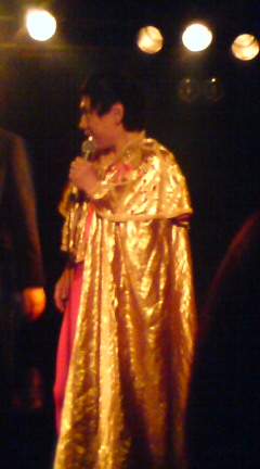 写真は登場の衣装が無駄に派手な師匠。挨拶がわりにアイスコーヒーのジョッキを20メートルのストローを使って三点倒立で一気する師匠。テニスラケット通り抜けをしながらポーズをきめる師匠。